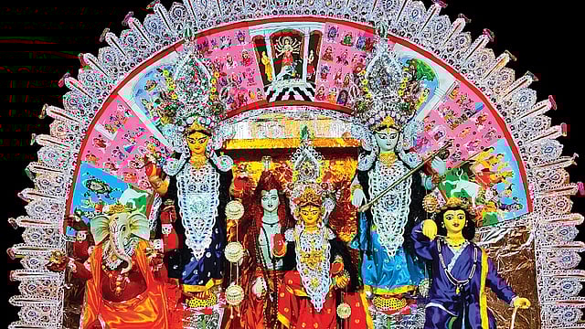 The foundation of the Barisha Durga Puja was laid in 1610 CE by Ray Laksmikanta Gangopadhyay Majumdar Choudhury and Bhagabati Debi, marking the first instance of worshipping goddess Durga alongside Lakshmi, Saraswati, Ganesha and Kartikeya within the same chaalchitra, a tradition that later became widespread. As the family expanded, eight additional Pujos were established. The rituals are meticulously followed according to Bidyapati’s Durgabhaktitarangini. A distinctive offering, known as mashabhaktaboli, is made on mahashtami and mahanavami to honour the presiding powers of trilok. Uniquely, this is the only Hindu family where the Tri-dhara Sangam — Shakta, Shaiva and Vaishnava traditions — are practised in unison.