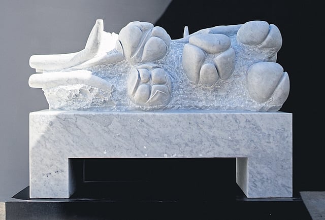 Shanthamani Muddaiah’s sculpture, Bloom, draws inspiration from the silken weaving traditions of her native Karnataka, where the art of sari-making holds deep cultural significance. The marble piece resembles a cloth twisted into the shape of a tree or shrub, symbolising the blooming of life and nature.