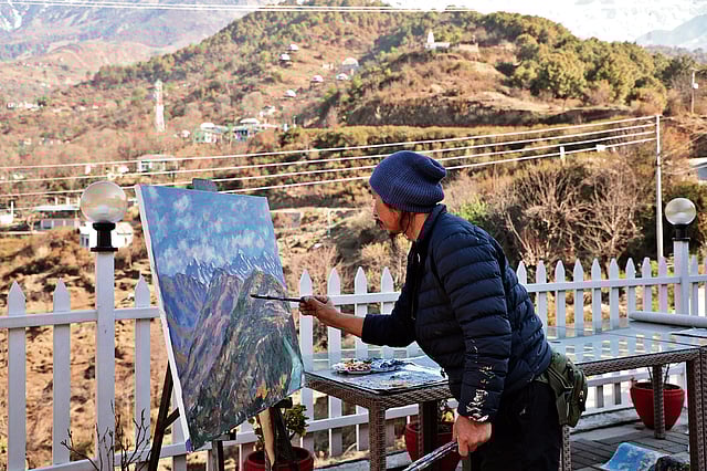 Crisp air. Cold mountain hush. The onset of summer, yet the sun seemed to have forgotten this corner of the Himalayas. In Mukteshwar, we arrived at jüSTa Mukteshwar Retreat & Spa just as Chitrashaala took over the property recently. Nearly 50 artists from across the world gathered here for a residency — rooms turning into studios, terraces into conversation pits, the valley into a living canvas. Some worked purely from imagination; others stood before the sweeping Kumaon landscape, translating its silvery light and cedar-lined horizons into paint. Over a week, the hotel became a self-contained creative ecosystem, with food, stay and logistics taken care of — so, the artists could simply create and connect. The works born here do not remain confined to the hills; they travel onwards, finding permanent homes across jüSTa Hotels & Resorts nationwide, extending the residency’s afterlife into other spaces and cities.