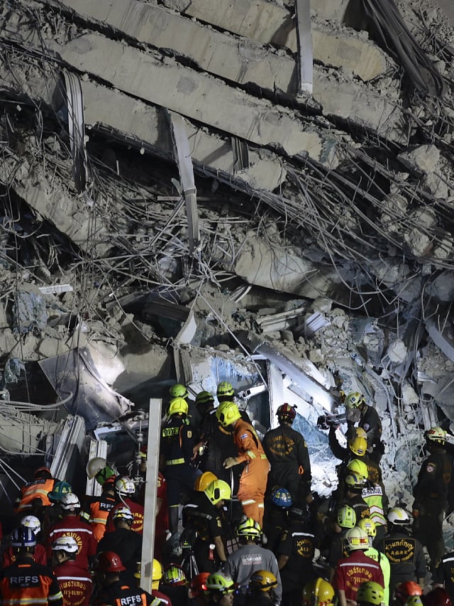 Relatives of workers of a under construction building that collapsed after a strong earthquake wait as rescuers search for victims, in Bangkok.