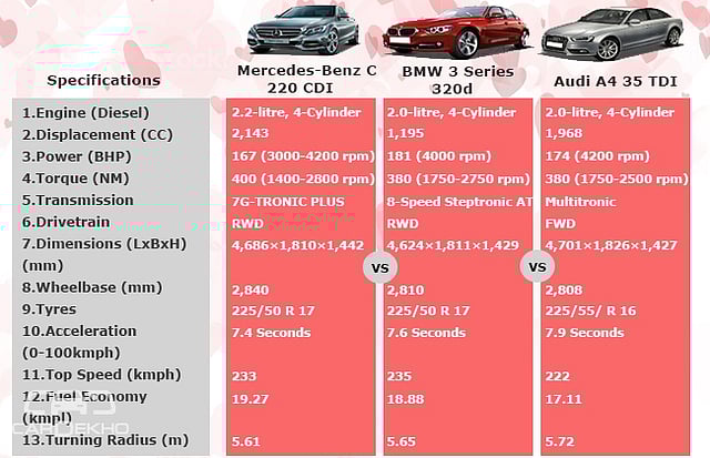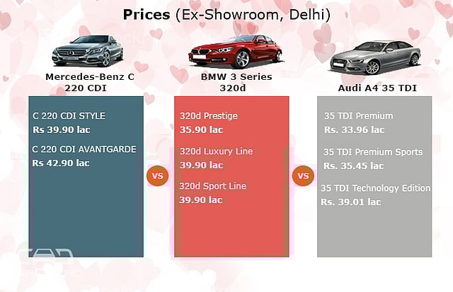 So, looking at the above description, it is clear that all the three cars carry their own uniqueness and only pricing is the factor that differentiates them. As one of the decisive factors, the pricing of Mercedes Benz C-Class 220 CDI starts at INR 39.90 lac while BMW 3 series 320d and Audi A4 35 TDI base variants are tagged at INR 35.90 lac and 33.69 lac respectively.