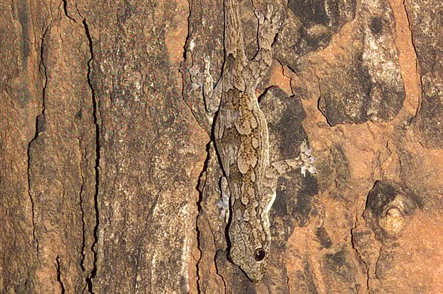 Yet another group of lizards, the geckos, use camouflage to protect themselves and hunt for prey. Geckos are widespread throughout the country and they live in varied habitats such as houses, trees, rock piles, termite mounds and rocky outcrops. The most common group, the kind we see in our houses near lights, have pads on their feet, which allow them to grip vertical surfaces like walls or tree trunks. One of these geckos, called the Bark Gecko, has a bark-like pattern that makes it difficult to spot on the bark of trees. Their excellent camouflage, coupled with the fact that they are nocturnal, make them difficult to spot. Check out the trees and the outside of your home with a torch tonight, and you might just spot a cleverly hidden gecko in your own backyard!