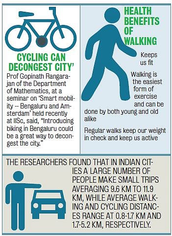 Dr Ashish Verma, an assistant professor at the Centre for Infrastructure, Sustainable Transportation and Urban Planning (CiSTUP) at Indian Institute of Science (IISc), Bengaluru, and his student T M Rahul say, “If at least one per cent of Bengaluru’s population walk or cycle, the savings add up to an astounding Rs 2.5 lakh per day by way of reduced fuel, pollution, congestion and accident costs.”
