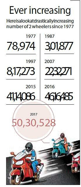 As of December, 2017, Bengaluru has 50,30,528 two-wheelers of a total vehicle population of 72,58,889, which constitutes 69.30 percent.