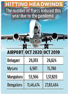 KIA had 31,446 international passengers in October, as against 3,98,280 last year, a fall of 92.1 per cent. In the first half of this financial year, 1,25,379 international passengers used the airport, as compared to 28,30,003 in 2019. BIAL CEO Hari Marar reserved comment.