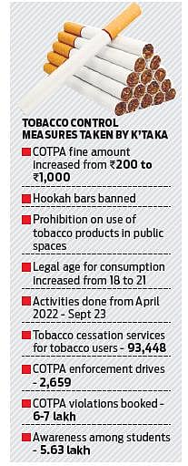 Dr Rajani P, State Nodal Officer for National Tobacco Control Cell (NTCC), said, “Karnataka is on top in terms of booking COTPA cases and creating awareness at the ground level since 2019. All district-level control centres have been taking measures to create awareness about creating tobacco-free education institutions (ToFei) in the state.”