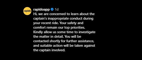 Rapido responded, saying, “We are concerned to learn about the captain’s inappropriate conduct during your recent ride. Your safety and comfort remain our top priorities. Kindly allow us some time to investigate the matter in detail.”
