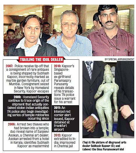 Uma Parameswari idol was stolen from an ancient Shiva temple in Ariyalur district of TN, a few years ago. It was smuggled to the USA, where it was sold at Kapoor’s former New York City gallery ‘Art of the Past’. Meanwhile, Singapore based Asian Civilisations Museum (ACM) had purchased it in 2007 at a cost of $650,000, unaware that that idol was illicitly trafficked. “But, the arrest of Kapoor by the Tamil Nadu police came as shot in arm with ACM volunteering to return the idol to India. We were able to establish the roots of the statue, thanks to an FIR registered by the cops regarding theft of idol,” an ASI official said.