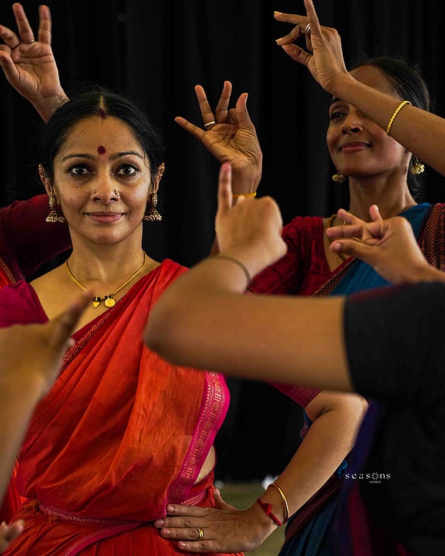 This production also brought a lovely change in their own roles. After twenty years of dancing together, Shijith now guides from the sidelines as the choreographer, while Parvathy dances with their students. “This would be the first time that we are doing it like this. He’s just sitting there and guiding us. So I have a different position to play. It’s very interesting,” she notes. For her, dancing in a group with younger students is both a challenge and a joy. “Solo is much easier. But I’m also enjoying that youth and that spirit,” she says.