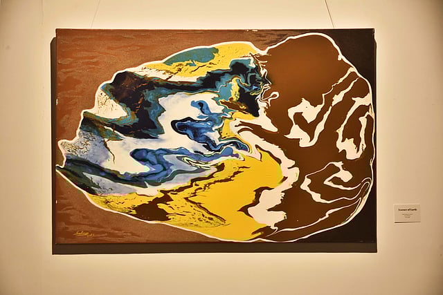 In ‘Spirit of the Sea’, a human face rises from swirling waves, celebrating harmony between humanity and the ocean. ‘Echoes of Time’ depicts an abstract turtle, its fragmented form reflecting the fragile bond between people and the planet. In ‘Suffering Spirits’, split faces in green and blue weep for land and water — a poetic indictment of deforestation and pollution. Each piece carries his signature connection with nature — the same element that shaped his sand sculptures. “My sand art started from nature,” he said. “These paintings, too, are about nature, balance, coexistence, and reflection.”