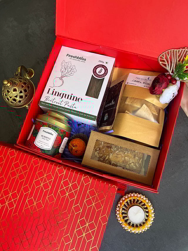 For those seeking festive indulgence with a healthy twist, Darshana’s Home Pastries offers the best of both worlds. Founded by home baker Darshana Bokdia, the decade-old venture is known for its eggless and vegetarian desserts — from cakes and fudges to cookies and truffles – all with a shelf life of up to 20 days. Her Deepavali hampers, a six-year tradition, are thoughtfully curated to balance health and taste. Priced between Rs 350 and Rs 1,999, they range from a simple box of Quinoa Almond Rocks to premium assortments with millet cranberry mukhwas, bagel makhana mix, sriracha cashews, and ragi double chocolate cookies. “Whatever you pick for your family from us, we promise it will bring together taste, quality, and presentation,” says Darshana. Pre-orders before October 10 receive a 10% discount on a minimum of five hampers.