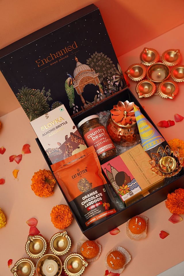 For those looking for freshly-baked eggless artisanal bakery goods this Deepavali, Enchanted Bakehouse is your go-to-destination. Founded in 2023, the business model offers eco-friendly and sustainable hampers. This year, they have come up with a list of items in their customisable hamper. Some of the small hampers include Truffle Madness (chocolate truffles — 9 pieces, and truffle box) at Rs 650, Regalia (cracker chocolates — 9 pieces, and premium chocolate box) at Rs 400, Cracker Glow (cracker chocolates — 12 pieces, and premium chocolate box) at Rs 500. A few hamper options also provide option to send a personalised note card. These are Regal Glow (cracker chocolates — 9 pieces, namkeen chilli garlic, namkeen mango achari, motichoor candles — 2, 30 gram milk chocolate nut butter, premium acrylic bag, and personalised note card) at Rs 750. Similar hampers are Party Glow at Rs 950, Amber Glow at Rs 1,500, and Diamond Glow at Rs 1,650. Enchanted treasures ranging from Rs 3,100 for 500+ orders to Rs 3,500 for up to 100 orders, Festive royal from Rs 3,600 for 500+orders to Rs 3,800 for up to 100, Maharani Edit at Rs 2,800 to Rs 3,000, Golden Hour, and Luxe edit are for bulk orders that comprise sweets, savouries, a premium wooden tray, and a personalised note card. Chinmaie Gorla shares her Deepavali message, “This Diwali, Enchanted celebrates the joy of thoughtful gifting — where every bite tells a story of craftsmanship, purity, and care,” she concludes.