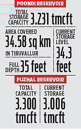 At Puzhal lake, the water levels were at 91% of its full capacity with the current storage at 3.006 tmcft against its total capacity of 3.300 tmcft.