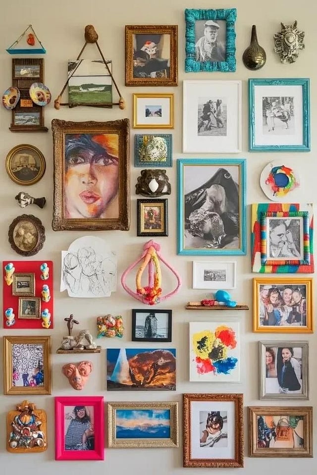 There are no rules when it comes to gallery walls except one: they must have meaning and be more than just store bought posters. The sizes, shapes, and colours can all be mixed to curate something more than ordinary. The easiest way to do this is by mixing portraits and landscapes with regard to orientation. If the spacing between the frames and collectables is uniform, walls are a blank canvas for galleries. The usual space between 2 frames is 3” to avoid a cluttered view.