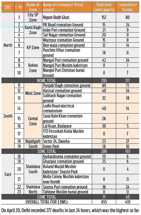 The mayor said arrangements have been made to minimise the inconveniences faced by city residents who have to go one place to another to get information about all cremation grounds. Badi Panchayat Vayshya Besey Agarwal organisation, which manages the crematorium at Nigambodh Ghat, has also reserved more platforms for Covid victims’ last rites. At present, 150 podiums are available. Suman Gupta, general secretary of the organisation, said that till Tuesday late evening, nearly 200 funerals took place at the Ghat.