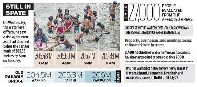 At 5 pm on July 10, the Yamuna River in Delhi had crossed the danger mark of 205.33 metres. The river reached 208.66 metres last Thursday, surpassing the previous record of 207.49 metres set in September 1978 by a significant margin. It breached embankments and penetrated deeper into the city than it has in over four decades. The flow rate at the Hathnikund barrage saw a marginal rise on Tuesday afternoon, oscillating between 50,000 and 60,000 cusecs. It dropped to around 39,000 cusecs by 7am on Wednesday. One cusec is equivalent to 28.32 litres per second.