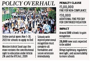 The DoE’s online portal for submission of applications will open on November 1, 2025. All schools willing to seek recognition may apply till November 30, 2025. After the completion of the application process, the applications will be scrutinised, and a list of such schools that meet all the prescribed criteria for recognition will be issued.