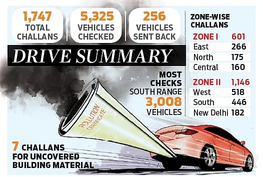 Police said they checked 5,325 non-destined vehicles, of which 256 were sent back. Zone-II checked 4,758 vehicles and returned 192, while Zone-I checked 567 and returned 64. The southern range inspected the highest number of non-destined vehicles (3,008), followed by the western range (1,558), eastern (456), New Delhi (192), and northern (111).In Zone-II, seven challans were also issued for uncovered building material.