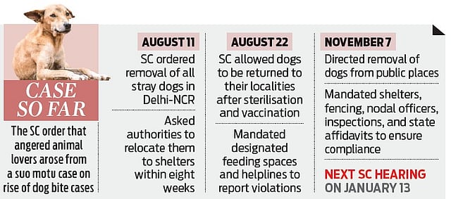 The SC on November 7 had ordered that all stray dogs be removed from public premises such as educational institutions, hospitals, railway and bus stands, and relocated to shelters after sterilisation. The court observed that releasing the dogs in the same spots would defeat the very purpose of the exercise.