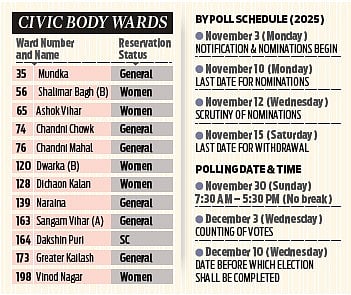 The bypolls will be held in Mundka, Shalimar Bagh-B, Ashok Vihar, Chandni Chowk, Chandni Mahal, Dwarka-B, Dichaon Kalan, Naraina, Sangam Vihar-A, Dakshin Puri, Greater Kailash, and Vinod Nagar wards.
