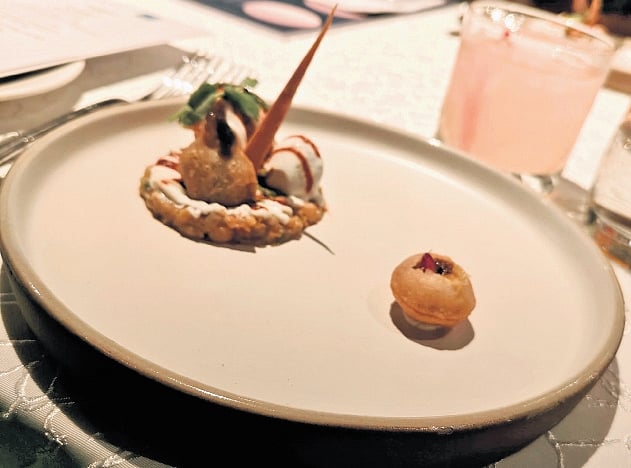 In dessert there were three dishes — Pistachio Gujiya with White Chocolate, Daulat ki chaat with rose petal chikki and roasted almonds and Doda Burfi Treacle Tart with vanilla bean ice cream. Daulat ki chaat screamed opulence as they served Rs 500 notes with it (even though fake). The entire dining experience was full of not only tasty food but with inventive presentation.