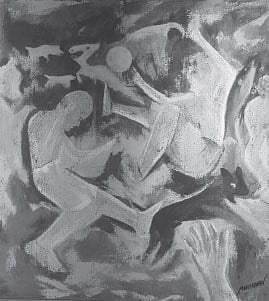 His most charming work is the ‘Life’ series of four paintings, set next to each other. In the first, called ‘Life 1’, painted in pink, violet and mauve, there is a suggestion of innocence and tenderness. In the second, which indicates youth, it is more lively, with mauve and yellow and has a nude woman’s body in the background. In the third, middle age is depicted in red, orange and green. Finally, old age is represented by grey and black colours. “The passage of life is in my thoughts,” says Manmadhan, a former News Editor of Mathrubhumi newspaper.