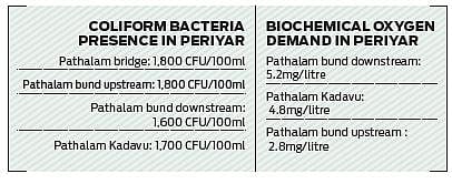 The Biochemical Oxygen Demand (BOD) — the amount of oxygen required to decompose organic matter in one litre of water — is also high along various stretches in the Periyar. The BOD level increases if sewage mixes with river water, with around 3mg per litre being the standard. At Pathalam bund downstream, BOD was found to be 5.2mg. At Pathalam Kadavu, it was 4.8mg. However, the Pathalam bund upstream recorded a reduced BOD of 2.8mg.