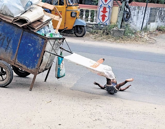 I was on personal travel in Thrissur, near the famed Punnathur Kotta elephant camp of Guruvayur. Though not on duty, I took my camera out as the vulnerability of this child of a nomadic ragpicker stirred me. Belonging to underprivileged communities, such children are often subjected to inhumane and unsafe conditions while their parents are at work. In this particular instance, the little one had been placed in a makeshift cradle fastened to the handrails of a pull-cart used to transport waste materials.