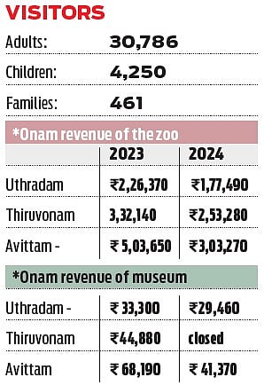 On the day of Onam, only the zoo remained open and it managed to collect Rs 2,53,280 in ticket sales. While on Uthradam, the previous day of Onam, both the zoo and the museum saw a combined ticket revenue of Rs 2,06,950. Despite the dip, Tuesday marked the busiest day in terms of ticket sales, with a large number of visitors arriving at both the zoo and the museum.