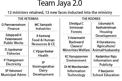 The new cabinet has a mixture of old and new faces, with 13 new faces and 12 ministers from the last government. Few senior members including former Speaker D Jayakumar and C Ve Shanmugham have returned to the cabinet, while others including Dindigul C Srinivasan, OS Manian and Dr V Saroja, both former MPs but first time members of the State Assembly, are also part of it. Jaya has retained Police, Home, Public, IAS, IPS, IFS Services and General Administration, while the portfolios of some of the ministers from the last regime have been reshuffled. Senior member, S Semmalai has been chosen as the pro-tem Speaker of the newly-constituted Assembly.Â