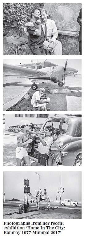 Her collection of black and white photographs spanning four decades unveils the quaint appeal and charm of the city and the people who make up its soul. Rivetting clicks in perfect frames abound. The slight scowl on the face of the old, wizened man sitting on a charpai near the wing of an aircraft. The Gateway of India telescoped through a window of the Taj Mahal Hotel at Apollo Bunder. A camel spanning the length of Marine Drive. Street-smart children on the road, some with a vacant expression, others with a searing look in their eyes... It is a slow, relaxed, organic pace at which the images emerge to chronicle the growth of the city.