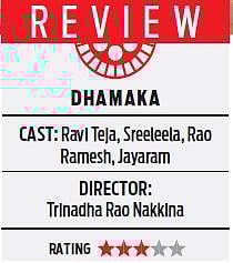 Dhamaka is yet another testament that this conviction is what separates Telugu filmmakers from others who try their hand at masala. There’s no stopping writer Prasanna Kumar Bezawada and Trinadha Rao when they are aiming to land a punch dialogue or a joke; they charge at it without respite and go full throttle. What could have been one-line gags here are fleshed out into extended sequences. Take, for instance, the scene where Swamy (Ravi Teja, back to what he does best, comedy) learns about the hierarchy of the goons and decides to hit the biggest of them all. You expect the joke to end with dialogues but no, the film spins a whole sequence of action out of it and garnishes it with Ravi Teja’s trademark comic timing. Does it serve a huge purpose to the story? Not really, but it doesn’t annoy you either. In fact, it amuses you at many points. That’s something I can say about Dhamaka as a whole.