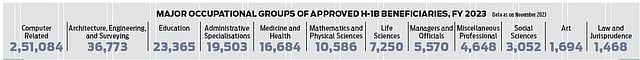 As per the latest information available with the US Citizenship and Immigration Services (USCIS), some 3,86,000 H-1B applications were approved in 2023 (October 2022-September 2023). This includes nearly 1,19,000 new H-1B visas and approximately 2,67,000 extensions of existing visas. The total visa approved for 2023 is a decrease from over 4,74,000 in 2022. The latest data revealed that approximately 72% of visas were issued to Indian nationals, followed by 12% to Chinese citizens.