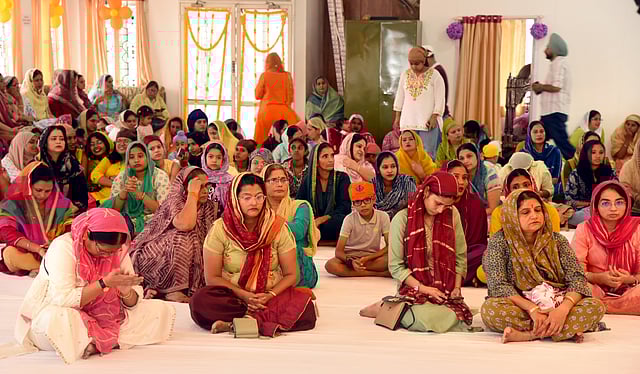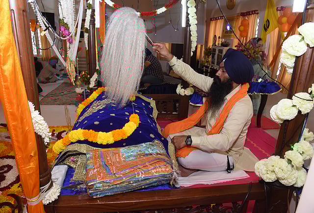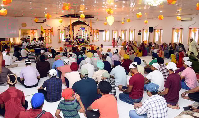 At the centre, the Guru Granth Sahib — the holy text of Sikhs — rests under a colourful canopy, adorned with floral garlands. Hundreds trickle in, silently in reverence to the hymns, to bow before the Book.