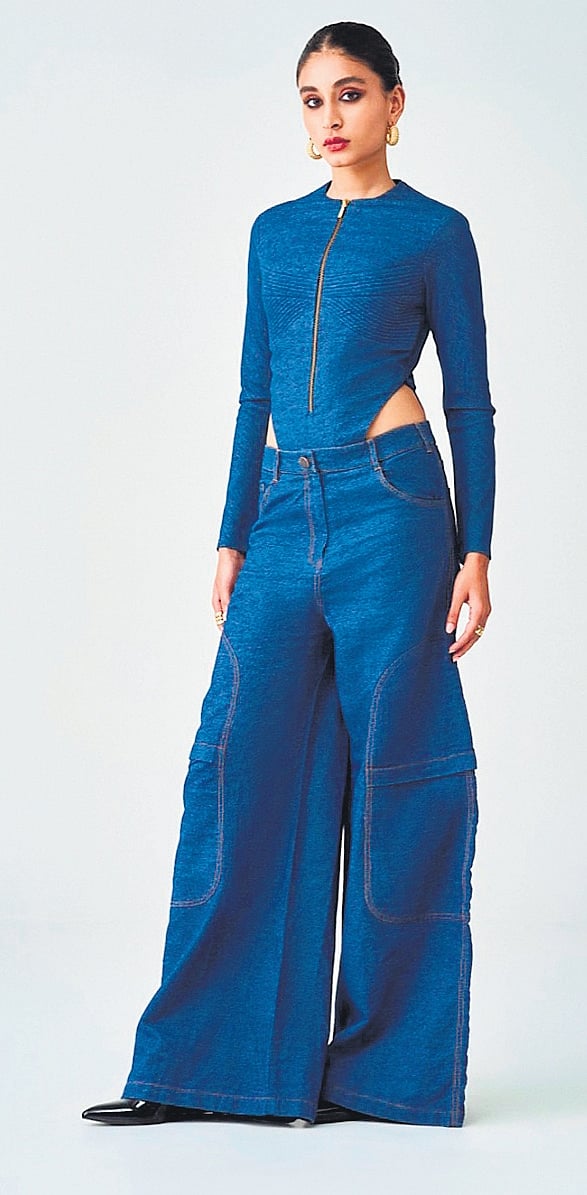 This mid-rise flared jeans by Saaksha & Kinni come with exaggerated stitch pocket detailing. For the perfect look, mention your height while placing your order. The designers call baggy jeans the It-girl ensemble of the season. The jeans make a bold statement as they are oversized, versatile and can be dressed up or down, they say.