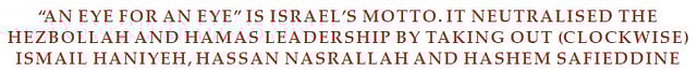 AN EYE FOR AN EYE: The Old Testament rule of “an eye for an eye” is Israel’s motto. Its tactic of neutralising the Hezbollah leadership, both at the top and the ground level, is wildly successful.