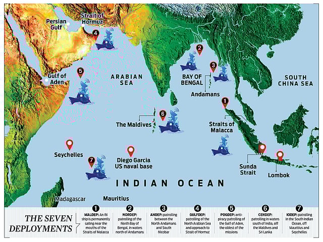 The re-orientation to “Mission based deployments” (MDP) has meant that nearly 15 warships of the Indian Navy are patrolling seven areas of the waters around India, beyond the country’s Exclusive Economic Zone (EEZ), keeping an eye on all entry and exit routes to and from the Indian Ocean.