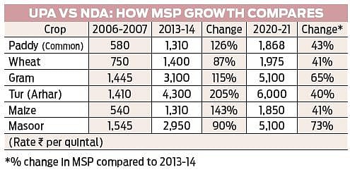 But, according to data, between 2006-07 and 2013-14, when the UPA was in power, there was a 90 to 205% rise in the minimum support price (MSP) of major crops, including paddy, wheat, arhar, gram, maize and masoor.