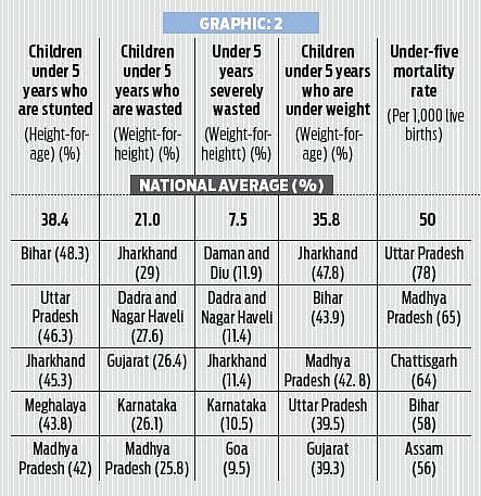 States where the percentage of under-five children who were stunted — an indicator of malnutrition — was significantly higher than the national average were Bihar, Uttar Pradesh Jharkhand, Madhya Pradesh and Meghalaya (See GFX-2). Bihar, Jharkhand, MP and UP also fared poorer than the already critical national average (35.8%) of children under-five who are underweight.