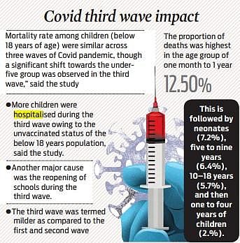 The proportion of deaths was highest in the age group of one month to 1 year (12.5%), followed by neonates (7.2%), five to nine years (6.4%), 10–18 years (5.7%), and then one to four years of children (2.4%). “Mortality rates were similar across the three waves of the pandemic, though a significant shift towards the under-five group was observed in the third wave,” said the study, which was held to evaluate the factors associated with mortality of a multi-centric cohort of hospitalised Covid-19 children from 42 hospitals across India.