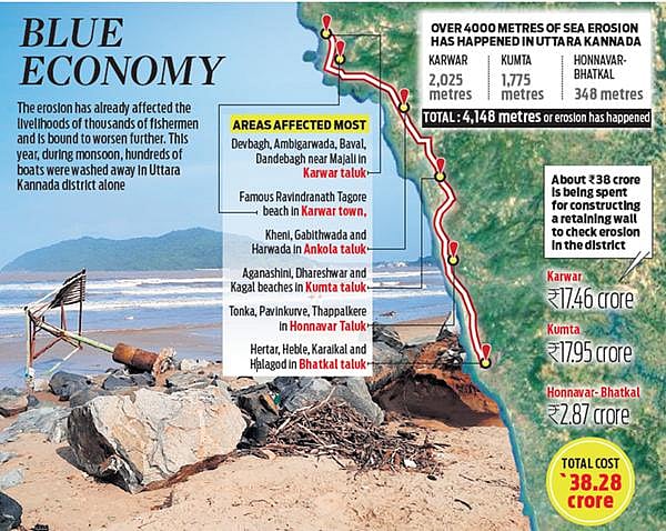 KARWAR/UDUPI(KARNATAKA: Sea erosion is increasing every year on the West Coast, particularly in Uttara Kannada, where it was so far considered not a serious issue. While experts say the erosion is due to global warming, beaches will soon be lost and thousands of fishermen will be badly affected. They have stressed on proper long-term planning to protect the coast and its economy.