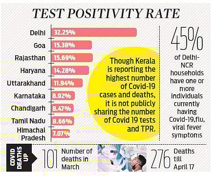 Delhi, which according to the latest survey, has shown that 45 per cent of Delhi-NCR households have one or more individuals currently having Covid-19, flu, viral fever symptoms, has 32.25 per cent TPR - the highest in India – reported on April 17.