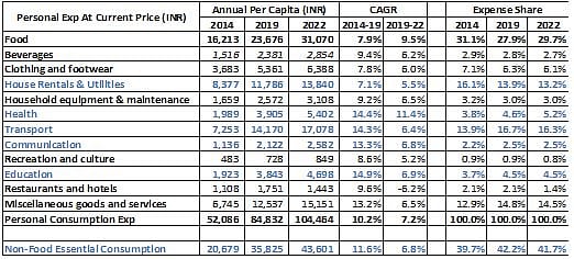 An analysis of personal consumption expenditure, as given in the table below, suggests that the share of non-food essential consumption (highlighted in blue) has gone up from 39.7% to 41.7% during the last 8 years.