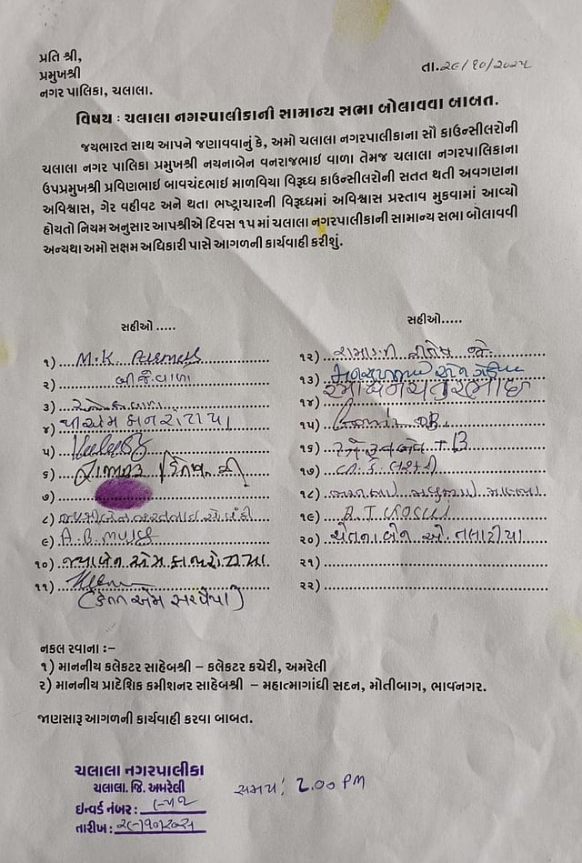 The Congress highlighted how Amreli district has allegedly become a symbol of the rot. In Chalala Nagar Palika, the internal power struggle has boiled over — 20 out of 24 members have filed a no-confidence motion against the BJP president and vice-president.
