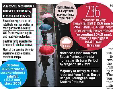 He also mentioned that La Niña would negatively impact the northeast monsoon over Puducherry and Tamil Nadu by reducing rainfall intensity. The IMD noted that October was one of the wettest months in the past five years, with a significant number of heavy and extremely heavy rainfall events. October 2025 recorded thesecond-highest rainfall (112.2 mm) since 2001 and was the 16th highest since 1901.