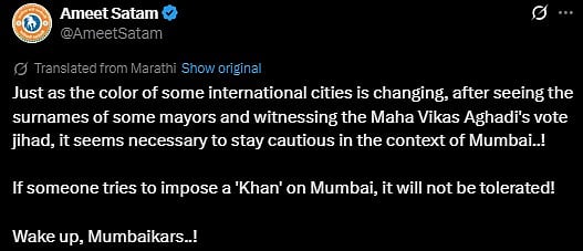 In a post on X, Satam, who is also the MLA from Andheri West, referred to Mamdani’s win as a signal of politics that he believes could be replicated in Mumbai. “Just as the colour of some international cities is changing, after seeing the surnames of some mayors and witnessing the Maha Vikas Aghadi's vote jihad, it seems necessary to stay cautious in the context of Mumbai… If someone tries to impose a ‘Khan’ on Mumbai, it will not be tolerated! Wake up, Mumbaikars!” he wrote.