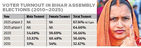 NEW DELHI: The 2025 Bihar Assembly election has seen one of the highest voter turnouts in the state’s history. This signals a major resurgence of democratic participation. According to the Election Commission of India, Phase 1 recorded a turnout of 64.66%. Phase 2 rose even higher, reaching 67.14% by 5 pm on Tuesday, November 11, and setting a new two-decade benchmark. The ECI has yet to publish the exact gender breakdown. Compared with the 56.66% turnout in 2020, the surge is striking. This marks an 11-point jump in just one election cycle.