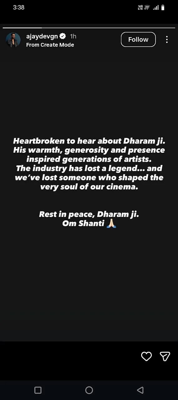 “Heartbroken to hear about Dharam ji. His warmth, generosity, and presence inspired generations of artists. The industry has lost a legend… and we’ve lost someone who shaped the very soul of our cinema. Rest in peace, Dharam ji,” he wrote.