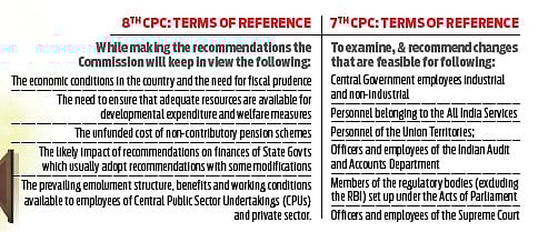 The 8th CPC has its ToR on five counts, which include the economic conditions in the country and the need for fiscal prudence, the need to ensure that adequate resources are available for developmental expenditure and welfare measures, the unfunded cost of non-contributory pension schemes, the likely impact of the recommendations on the finances of the State Governments, which usually adopt the recommendations with some modifications and the prevailing emolument structure, benefits and working conditions available to employees of Central Public Sector Undertakings and private sector.