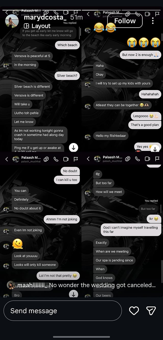 Around November 24–25, screenshots purporting to allegedly show Muchhal in flirty chats with a woman named Mary D’Costa circulated on Reddit, Instagram, and X, going viral. The messages, dated April–May 2025, suggested a brief, month-long interaction. Mary D’Costa took to Instagram to say that she had never met Muchhal in person, was not a choreographer, and had no involvement with the wedding. She stated that the screenshots misrepresented the interaction and that she had no romantic involvement with Muchhal.